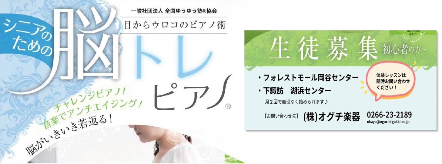 岡谷店頭 営業日お知らせ一覧を見る2026年2月24日 「脳トレピアノ®」を新たに展開!2026年2月2日 棚卸のお知らせ(2/27)2026年1月7日 決算フェアのお知らせ2025年12月2日 冬期休業のお知らせ2025年10月21日 桐朋学園 秋の無料体験・見学のお知らせ イベント情報一覧を見る2026年1月21日 2026年2月14日(土) ヤマハ音楽教室発表会2025年12月3日 クリスマスオーナメントを作ってみよう!2025年10月14日 2026年4月「10~6 級ピアノ・エレクトーン演奏グレード」のお知らせ2024年12月10日 2025年4月「10~6 級ピアノ・エレクトーン演奏グレード」のお知らせ2024年11月15日 鷹野雅史&川田祐子 Electoneコンサート「Dear STAGEA!」 イベント結果一覧を見る2023年10月12日 2023年10月8日(日)エレクトーンフェスティバル オグチ楽器大会 結果発表2022年11月30日 2022年11月23日(水)エレクトーンフェスティバル 長野・山梨大会 出場グループ2022年11月25日 2022年11月23日(水)エレクトーンフェスティバル 長野・山梨大会 結果発表2022年10月12日 2022年10月9日(日)エレクトーンフェスティバル オグチ楽器大会 結果発表2021年12月4日 2021年11月28日(日)エレクトーンフェスティバル2021 チケット情報一覧を見る2025年10月28日 2026年3月29日(日) 子供のための♪ワクワクコンサート
