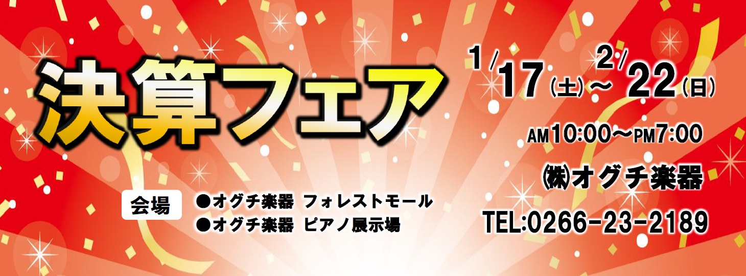岡谷店頭 営業日お知らせ一覧を見る2026年1月7日 決算フェアのお知らせ2025年12月2日 冬期休業のお知らせ2025年10月21日 桐朋学園 秋の無料体験・見学のお知らせ2025年10月3日 秋の特別フェアのお知らせ2025年10月3日 臨時休業のお知らせ(10/22) イベント情報一覧を見る2025年12月3日 クリスマスオーナメントを作ってみよう!2025年10月14日 2026年4月「10~6 級ピアノ・エレクトーン演奏グレード」のお知らせ2024年12月10日 2025年4月「10~6 級ピアノ・エレクトーン演奏グレード」のお知らせ2024年11月15日 鷹野雅史&川田祐子 Electoneコンサート「Dear STAGEA!」2024年7月2日 【第36回】桐朋サマーコンサート イベント結果一覧を見る2023年10月12日 2023年10月8日(日)エレクトーンフェスティバル オグチ楽器大会 結果発表2022年11月30日 2022年11月23日(水)エレクトーンフェスティバル 長野・山梨大会 出場グループ2022年11月25日 2022年11月23日(水)エレクトーンフェスティバル 長野・山梨大会 結果発表2022年10月12日 2022年10月9日(日)エレクトーンフェスティバル オグチ楽器大会 結果発表2021年12月4日 2021年11月28日(日)エレクトーンフェスティバル2021 チケット情報一覧を見る2025年12月3日 2026年2月8日(日) 信州サクソフォーンアンサンブル 第5回定期演奏会2025年10月28日 2026年3月29日(日) 子供のための♪ワクワクコンサート2025年10月21日 2026年1月24日(土) 伊東美紀フルートリサイタル