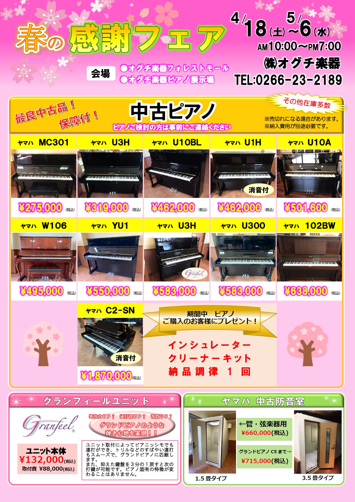 春の感謝フェアのお知らせ 2026年4月3日 4月18日(土)~5月6日(水)まで春の感謝フェアを開催いたします。 期間中にピアノをご成約のお客様には、インシュレーター・クリーナーキット・納品調律1回をサービス! エレクトーンをご成約のお客様にはヘッドホンをサービス!! 電子ピアノもお買い得です! この機会にぜひ、ご来店お待ちしております! ※ピアノ・エレクトーンをご検討の方は会場をご案内いたしますので、事前に0266‐23‐2189に ご連絡をお願いいたします。