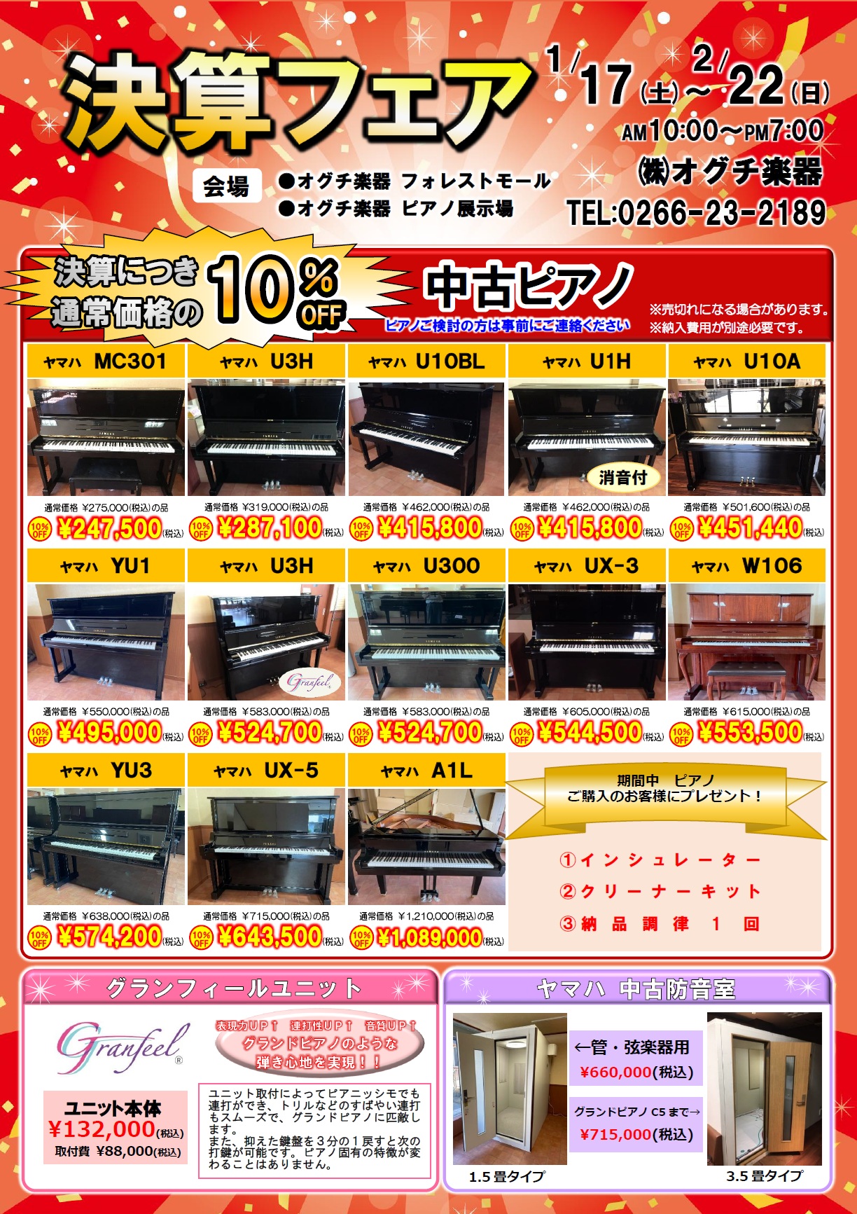 決算フェアのお知らせ 2026年1月7日 1月17日(土)~2月22日(日)まで決算フェアを開催いたします。 期間中にピアノをご成約のお客様には、インシュレーター・クリーナーキット・納品調律1回をサービス!! 中古ピアノは通常価格の10%OFF!! 今がチャンスです! ご来店お待ちしております。 ※ピアノをご検討のお客様は、会場が旧店舗になるため事前に0266-23-2189にご連絡ください。