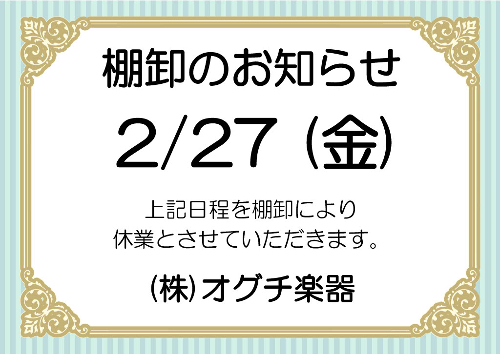 棚卸のお知らせ(2/27) 2026年2月2日 2月27日(金)は棚卸のため、全日休業いたします。 お客様には大変ご迷惑をおかけいたしますが、よろしくお願いいたします。 ※教室は、通常通りです。 (株)オグチ楽器