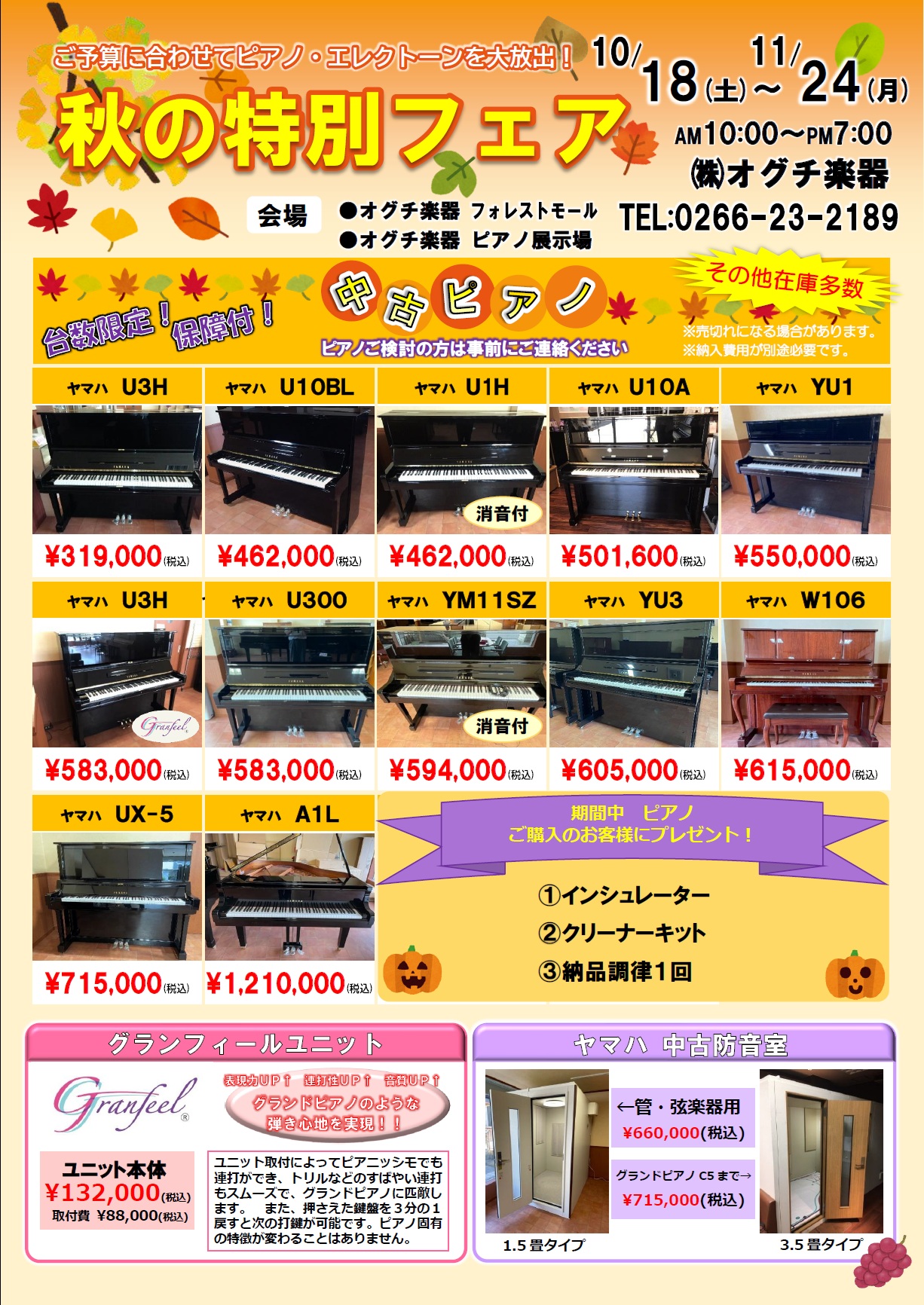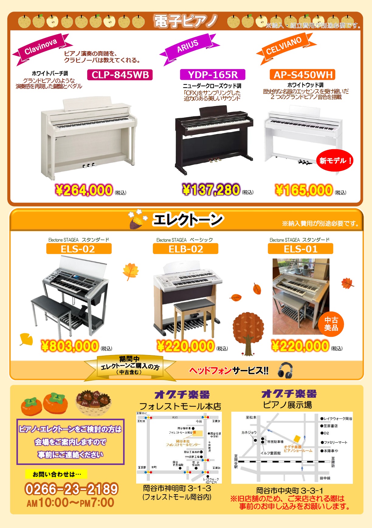 秋の特別フェアのお知らせ 2025年10月3日 10月18日(土)~11月24日(月)まで秋の特別フェアを開催いたします。 期間中にピアノをご成約のお客様には、インシュレーター・クリーナー キット・納品調律1回をサービス!! エレクトーンをご成約のお客様には、ヘッドホンをサービス!! ※ピアノ・エレクトーンをご検討の方は会場をご案内いたしますので事前に0266-23-2189にご連絡をお願いいたします。