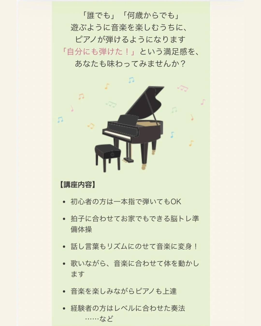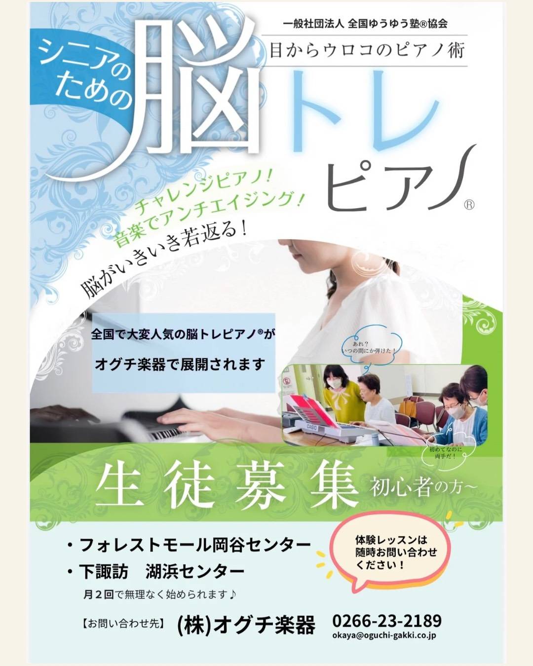 「脳トレピアノ®」を新たに展開! 2026年2月24日 「脳トレピアノ®」開講! この度、オグチ楽器では「脳トレピアノ®」を新たに展開することとなりました! フォレストモールセンター、下諏訪湖浜センターにて募集しております。 どなたでも何歳からでも受講いただけますので、ご興味のある方はぜひ<0266-23-2189>までお気軽にお問い合わせください♪